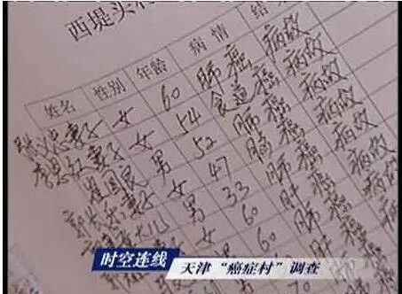 在杭州萧山坞里村,村民陈奇发血液病浑身都是疙瘩,看着非常恐怖。在村民韦东英家中保存着一份她在2004年至2005年间记录的村里癌症患者与死亡名单,从1992年至2005年,坞里村有近60人患癌症去世,年纪多在四五十岁,最年轻者20多岁,记者翻看这份沉重的死亡名单,发现村民们所患的癌症多是肺癌、胃癌、肝癌。