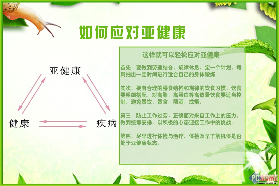 世界卫生组织根据近半个世纪的研究成果,将“健康”定义为“不但是身体没有疾病或虚弱,还要有完整的生理、心理状态和社会适应能力”。