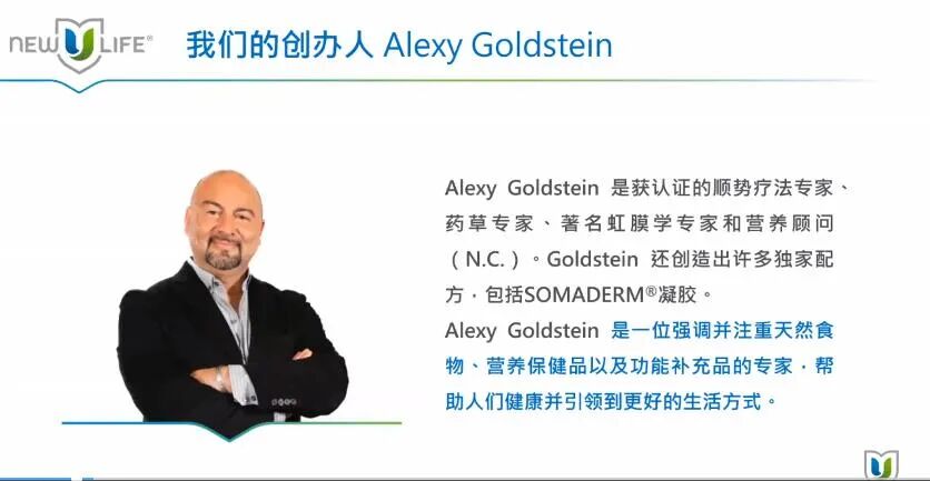 大家都知道我们的创办人是Alexy,就是NewULife的首席专家,我知道大家对他都很熟悉。从他的专业经历里面,大家可以看到,他是一个获认证的顺势疗法的专家、药学的专家以及虹膜学的专家和营养顾问。其实这几个部分也都是我正在研究的部分,我非常喜欢自然医学。