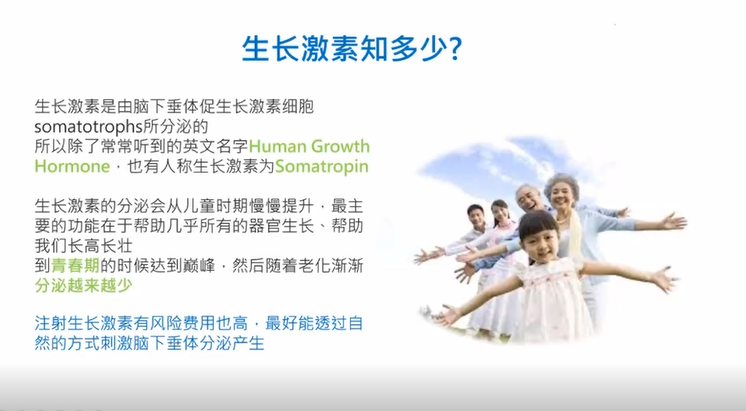以生长激素来说,Human Growth Hormone,也叫Somatropin。生长激素最特别的地方在于青春期的时候达到巅峰,但是随着老化慢慢分泌越来越少。我们希望冻龄,不要继续老化。如果能够让生长激素能够持续的分泌,就能够找到一个方式,除了注射和其他不好的方式以外,这个风险也很高,透过自然的方式来刺激脑下垂体分泌,这个就是最完美最佳的方式。