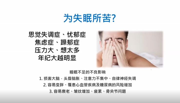 失眠来讲,有些人会失眠,有些人睡不好,现在已经非常普遍。为失眠所苦的人,我看过一些报道,也看到一些调查。以中国来说,大概有1/10以上的人为失眠所苦,大概有30-40%的人吃过安眠药。不一定是很严重的睡眠不足的问题,就是我觉得我失眠,找医生开个安眠药给我吃,这是一个非常普遍的问题。 失眠会造成哪些问题,或者说哪些问题会造成失眠,其实这是互相交叉的问题。像抑郁症、焦虑、忧郁等等这些问题,都可能造成失眠。或者说失眠,会让这些问题更加严重,尤其年纪越大的时候会更明显。 除了这几个部分以外,其实还有其他的,比如注意力不集中,这个是睡眠不足造成的。白天可能头昏脑胀的,甚至想减肥的人怎么减就减不下来,原因是在于没睡好。还有三高的问题,心血管像是高血压、高血脂的问题,血糖控管不好的问题。受到失眠影响,会让这些情况更加严重。当然如果没睡好也更容易衰老,皱纹会更多,法令纹会更多,骨关节的问题也会更加严重。