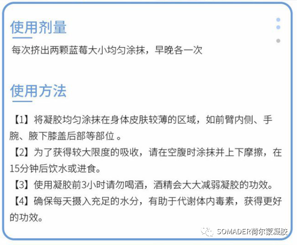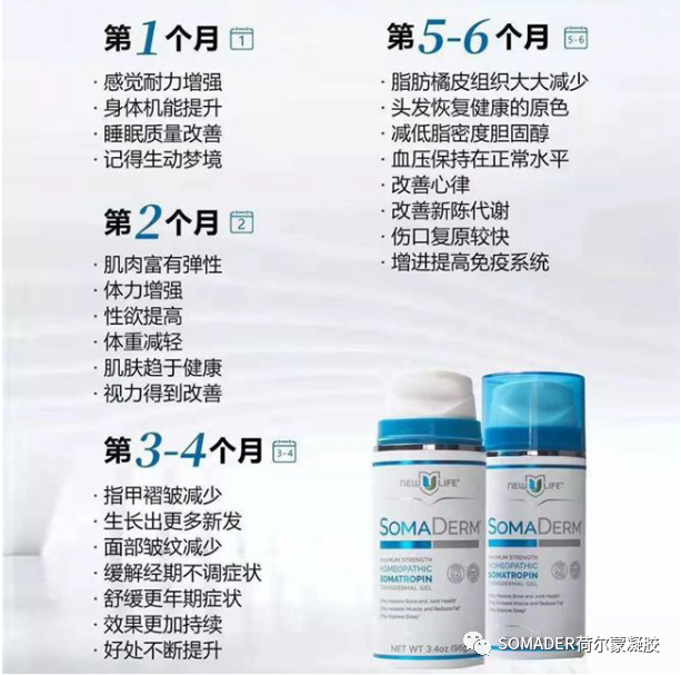 SomaDerm 凝胶可涂抹于腋下、前臂、手腕和膝盖后面。凝胶需均匀涂抹开,避免皮肤部分区域过于厚重。由于激素存储在脂肪组织层中,因此 SomaDerm 凝胶一定要涂抹在可见静脉的皮肤薄层区域。这样可以确保 SomaDerm 凝胶被直接输送到血液中。