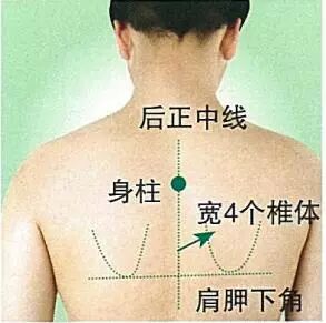 身柱穴在背部正中线上,第三胸椎棘突下凹陷中。取穴时采取俯卧位或者俯伏坐位,先定大椎穴,然后定身柱穴。