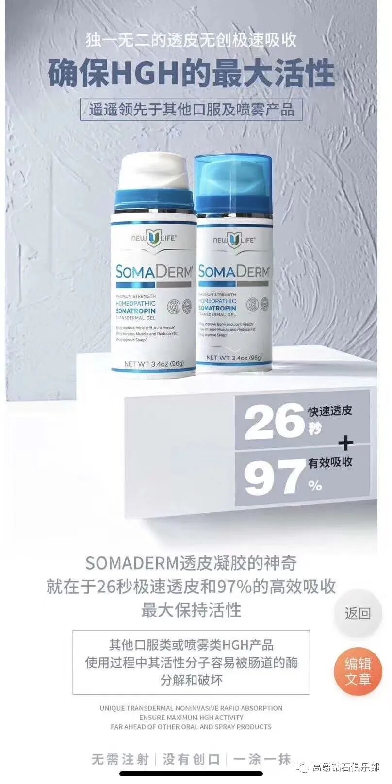 SOMADERM能够直接外源补充生长荷尔蒙,Newulife全新“高科技 · 涂抹式 · 更天然”的优势,可以涂抹于手腕、手臂、腋窝、膝盖后面等身体多个部位,渗透吸收滋养,再次感受逆龄的青春。产品已获得FDA国际注册和美国NDC编码,在美国5000多名医生、数十万人使用者効果明显!无一例投诉和产生副作用,非常安全!