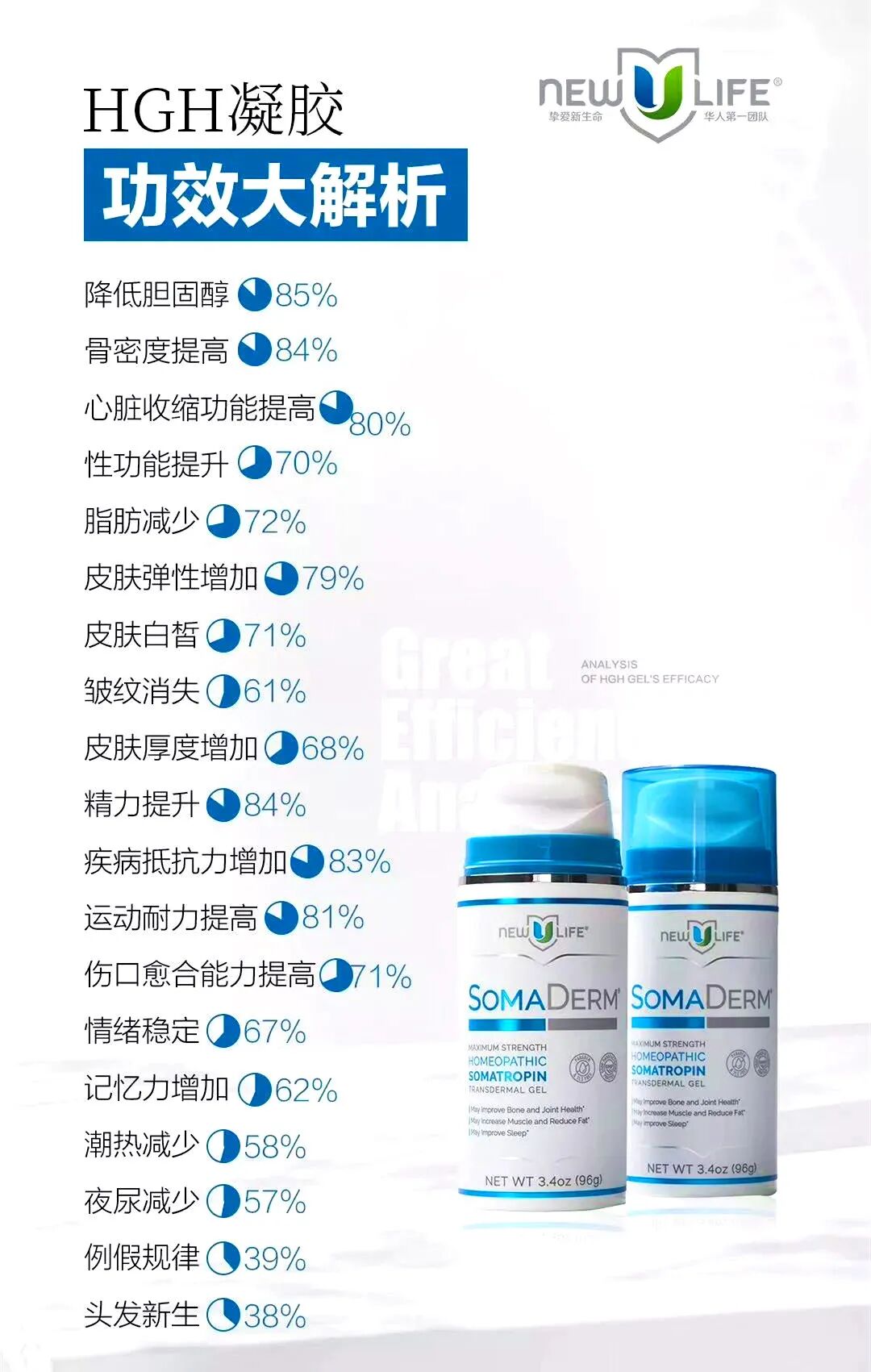 在12岁时人体胸腺开始萎缩,到40岁时已经萎缩到只有一枚葡萄干般大小,到60岁时就完全消失不见。HGH能使萎缩的胸腺增生恢复到原来的大小,使机体产生更多的T细胞,更多的抗体、红细胞、白细胞及自然杀伤细胞,来抵抗疾病,尤其是各种癌症。