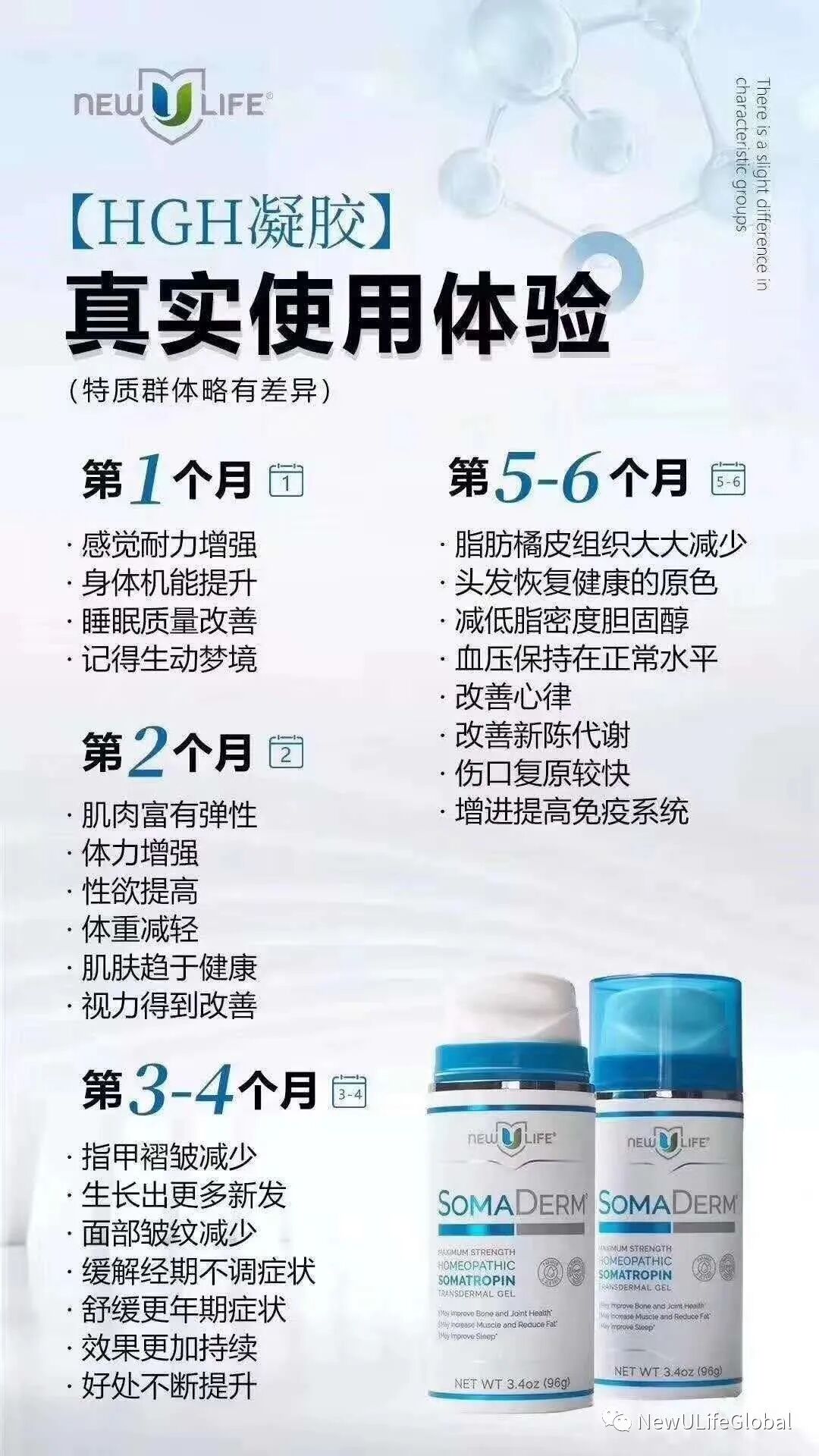 新生命 (New U Life) 推出的 SOMADERM™ 抗老凝胶是目前唯一一款透过皮肤吸收,使用超微剂量HGH (Homeopathic HGH) 的淡褐色凝胶,补充并激发脑垂体分泌自身所需之生长荷尔蒙,100%安全,100%合法,美国FDA注册,GMP认证,美国药品局7年监测,无需医生处方。