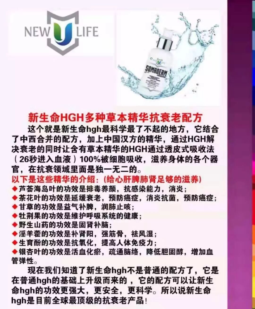 很多人错误认为使用生长荷尔蒙产品HGH属于激素类或类固醇药物. 如果是真的,我也拒绝使用. 但New u life 公司研发出的产品Somaderm Gel属于天然草本植物精华提炼出来的. 产品全部采用天然植物材料提取而成,经FDA 食品卫生安全局严格把关,唯一通过FDA 批准的安全,无任何副作用的HGH荷尔蒙. 产品通过手碗磨擦,迅速通过皮下脂肪和血管进入我们的脑垂体,激活脑垂体的生长荷尔蒙HGH细胞再生,因为脑垂体生长荷尔蒙HGH是控制我们身体各个器官的衰老功能,人类从三岁到二十五岁,是身体生长荷尔蒙的高峰期,所为有女人一枝花,男人精力最旺盛时期,结婚生子,工作升职,创业野心期,三十岁以后,精力逐渐走下坡,到四十岁,人体的生长荷尔蒙HGH已经流失80%,并以1%/-2%的速度每年流失,到五十岁只剩下1%的HGH生长荷尔蒙,过了五十岁,女人开始停经,更年期综合征开始出现.大多数生过孩子的女人还有肚皮松弛,性功能低下,骨质疏松,头发少,肌肉变成肥肉,脸部肌肤水分流失,脸黄,出现各种黄褐斑,黑斑,黑眼圈,气质流失. 男人因为承担工作上和家庭上的压力,抽烟喝酒,长期捱夜,出现白发苍老和身体机能衰老衰退比女人快,寿命往往比女人短. 美国new u life公司经过多年研发,使用天然植物制成的生长荷尔蒙HGH 跟人类自身产生的生长荷尔蒙HGH相近,每天早晚只要微量的天然HGH 生长荷尔蒙进入体内血管到达脑垂体,将脑垂体HGH生长荷尔蒙重新激活新的细胞,再通过血液流动到达身体各处,将老去和坏死的细胞重新激活,从而达到让人类变年轻,肌肤收紧,脂肪体变肌肉,发量增加,血脂,血糖,血压恢复正常水平. 骨胳关节恢复能力. 我自己也上网看了大量有关生长荷尔蒙到底用了对人类好不好?大量证据表明是好的,只有部份是使用过量摄入,注射大量过量的HGH 生长荷尔蒙所产生的副作用. 任何东西都有个度,过了就产生反作用,刚刚好就是最好的效果。
