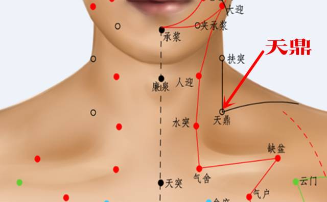天鼎穴属于手阳明大肠经,位于人体的颈外侧部,胸锁乳突肌后缘,当结喉旁,扶突穴与缺盆穴连线中点。