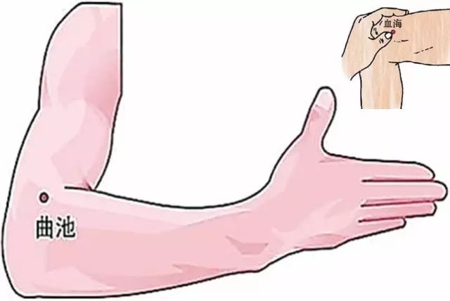 曲池穴位于肘横纹外侧端。屈肘,当尺泽穴与肱骨外上髁连线中点。