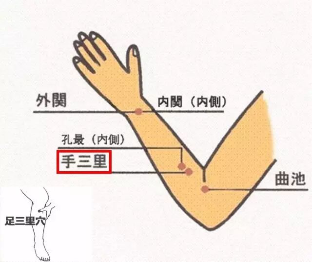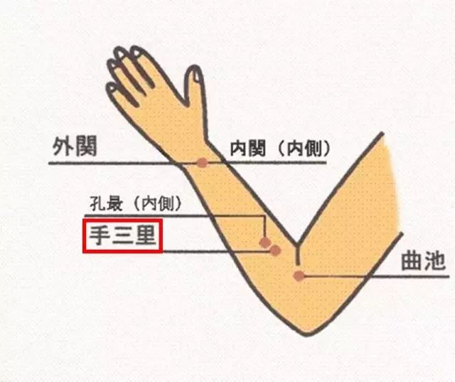 手三里属手阳明大肠经,位于前臂背面桡侧,当阳溪与曲池连线上,肘横纹下2寸。