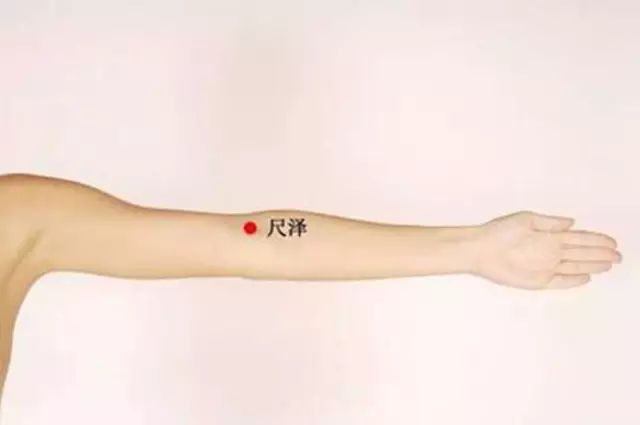 尺泽穴位于人体肘横纹中,肱二头肌腱桡侧凹陷处,微屈肘取穴。