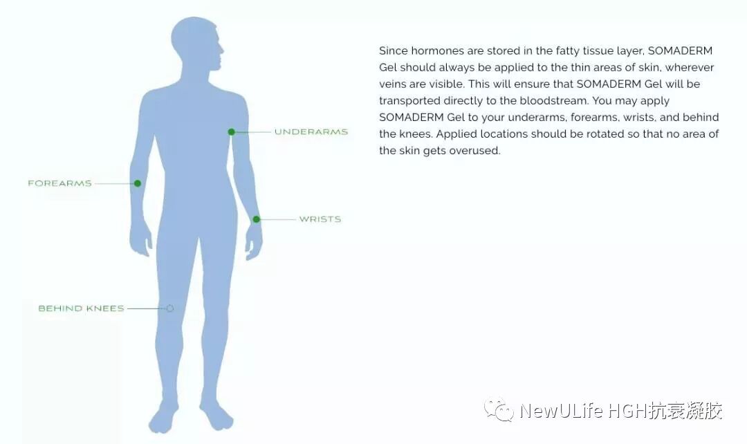 SOMADREAM凝胶是唯一一款经FDA注册顺势疗法透皮, 非处方,人类生长荷尔蒙产品,由于荷尔蒙存储在脂肪组织层中,SOMADREAM凝胶始终应用于皮肤的薄薄区域, 通过静脉血管微量吸收到血液中,有手腕, 肘窝, 腋下, 膝盖后,每次涂抹一个对应的位置,一天涂抹两次。