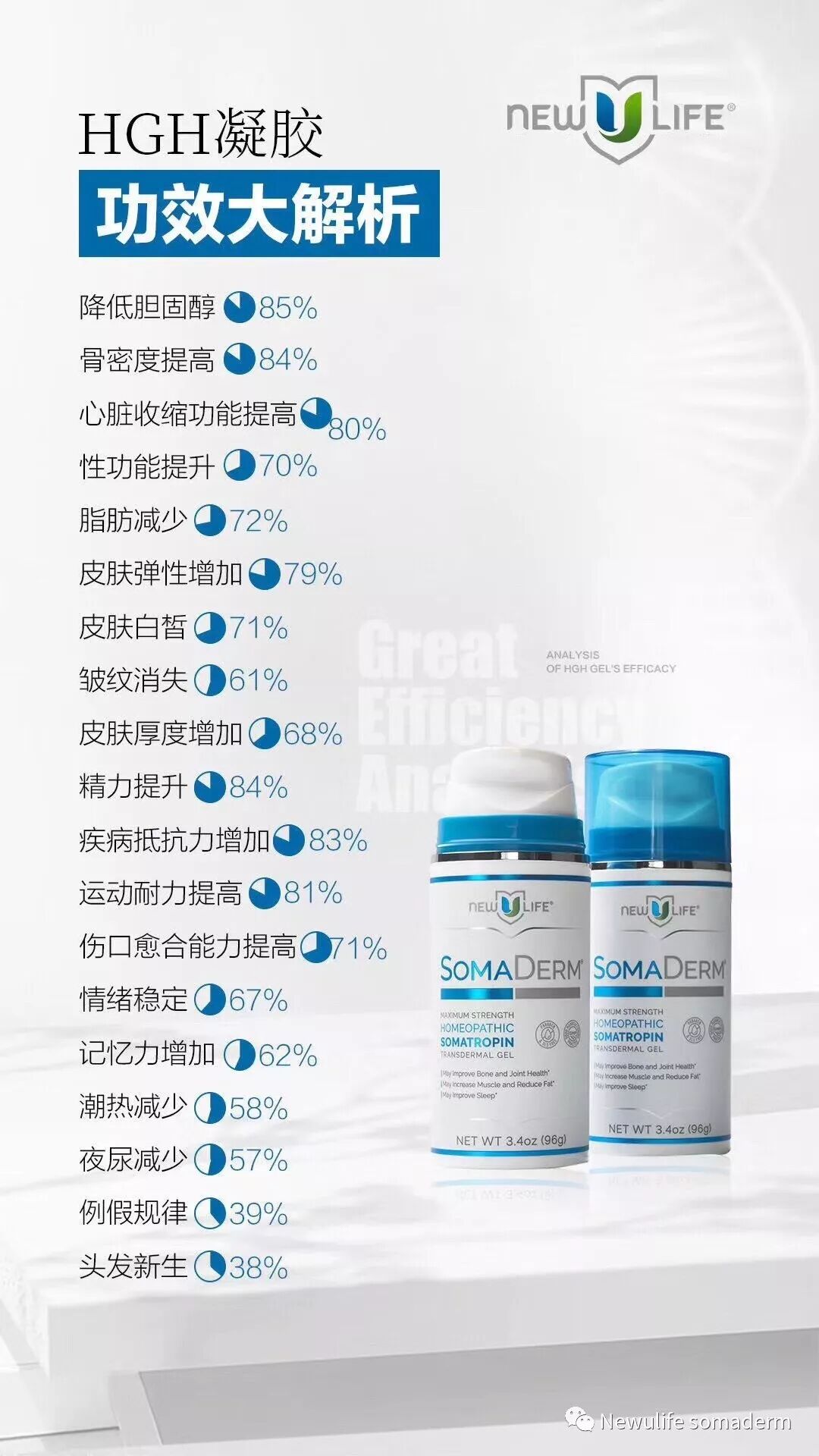 HGH通过生长介素促进氨基酸进入细胞,加速Collagen和Elastin及其白蛋白的合成。一个婴) L的细胞组织含水量约90%,而成年人约60%,老年人仅40%。HGH能通过肾脏促进水钠重吸收,将水分保持量提高到60%~70%,相当于二三十岁时细胞含水量。充足的细胞含水量和蛋白质的增加,使衰老的肌肤焕发青春光彩。