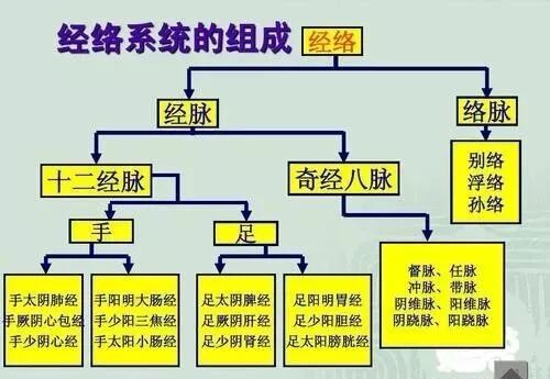 经络是什么呢?原来,我国古代劳人民在长期与疾病作斗争的医疗实践中,逐步认识到人体内存在着一些“气血”流行的通道。这个通道被中医称之为经络。它内而脏腑,外而肢节,纵横交错,遍布全身,起到运行气血的重要作用(类似人体的心血管、淋巴管等)。同时,又通过经络的复杂联系,将人体内外表里、上下前后、五脏六腑、四肢百骸、五官九窍、筋脉皮肉各个部分,统一成为一个有机的整体,并与外界环境相适应(类似人体的神经、内分泌)。经络既然有如此重要的作用,当然也是一个十分奥妙、复杂的系统,这个经络系统包括经脉和络脉两大部分,其中经脉是经络系统的主体部分,大而直行,深而在里,又可分为十二经脉和奇经八脉两大类,以及附属于十二经脉的十二经别,十二经筋,十二皮部;络脉是经脉的分支,小而横斜,浅而在表,又可分为较大的十五络脉,以及遍布全身的孙络、浮络。