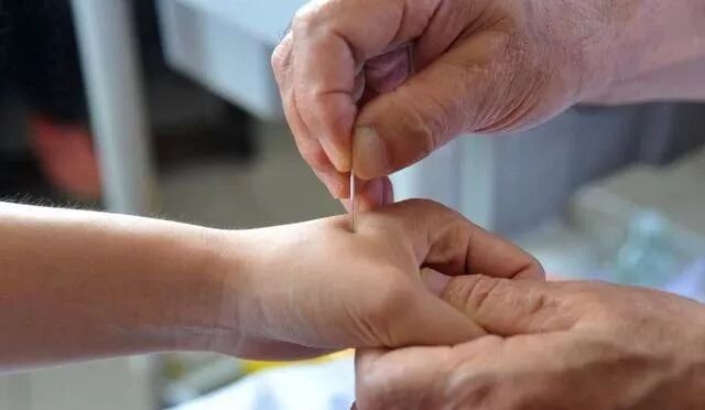 4.用左手拇、食、中三指捏紧被刺部位,右手持针,用拇、食两指捏住针柄,中指指腹紧靠针身下端,针尖露出3~5mm,对准已消毒的部位,刺入3~5mm深,随即将针迅速退出,轻轻挤压针孔周围,使出血少许。5.然后用消毒干棉球按压针孔。