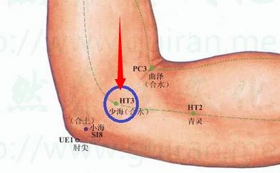 取穴方法:屈肘,肘横纹尺侧端与肱骨内上髁连线的中点处。