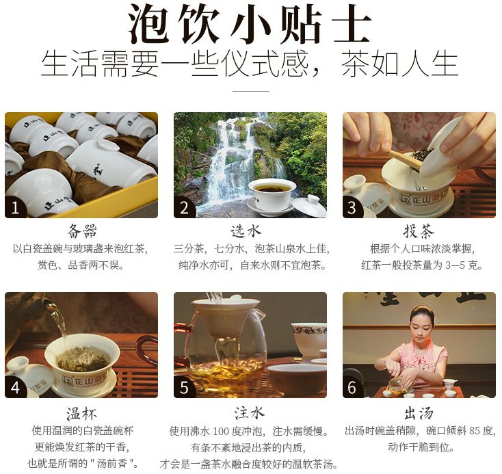 首先建议使用它适于用大壶或大杯冲泡,这样会更好的保持它的香味和滋味,有些茶待茶汤冷后会出现苦味或涩感,而正山小种茶汤冷后确会有甜味润口,且耐泡再浓也不苦的特点。用红茶茶壶茶杯组泡,杯子选用白瓷杯。如果确实要采用工夫泡法也可,最起码要用瓷类别的盖碗不能用紫砂壶冲泡的。将红茶放入白瓷杯中,然后冲入沸水,先闻其香,再观其香,然后品味。一杯茶叶通常可冲泡很多次(与乌龙茶的工夫泡法基本相同)。这种饮法,需要饮茶人在“品”字上下功夫,缓缓斟饮,细细品啜,在徐徐体味和欣赏之中,吃出茶的醇味,领会饮茶真趣,使自已心情欢愉,超然自得,获得精神上的升华。