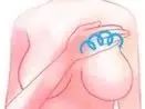 3、用食指和中指贴紧胸部夹起乳头,轻轻积压手指稍稍并紧,成圆弧形旋转。