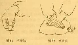 ②掌按法:按压后要稍作片刻停留,再做第二次重复按压。为增加按压力量,在施术时可将双肘关节伸直,身体略前倾,借助部分体重向下按压。