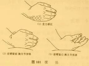 滚法对自学者来说有一定的难度,但因为在疾病的治疗上往往又少不了此法,所以尽可能作一简明叙述。整个手法动作是由两部份协调来共同完成:一是由前臂的旋转;二是由腕关节的屈伸而组成的复合式手技动作。其受力部位以小鱼际肌至第五、第四掌骨的背侧。