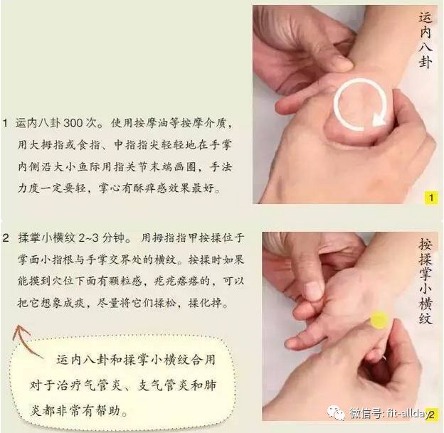 宝宝咳嗽时如果有痰出现,这说明宝宝除了肺系统失调外,脾胃也出现了问题。在中医的观点来看,脾虚则生湿,湿气转化为痰,所以脾为生痰之器,而肺为储痰之器。一旦咳嗽带痰,在治疗上除了要继续宣肺止咳外,还要用到很多健脾化痰的手法:运内八卦+按揉小横纹,对小儿肺炎支气管炎等等都有特效,特别针对6 岁以内的孩子,大家可以试一下。大一点的孩子在按摩的时间上要翻倍,这样效果才明显。(成人不适用,效果不好)