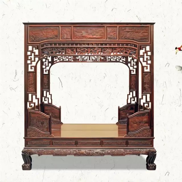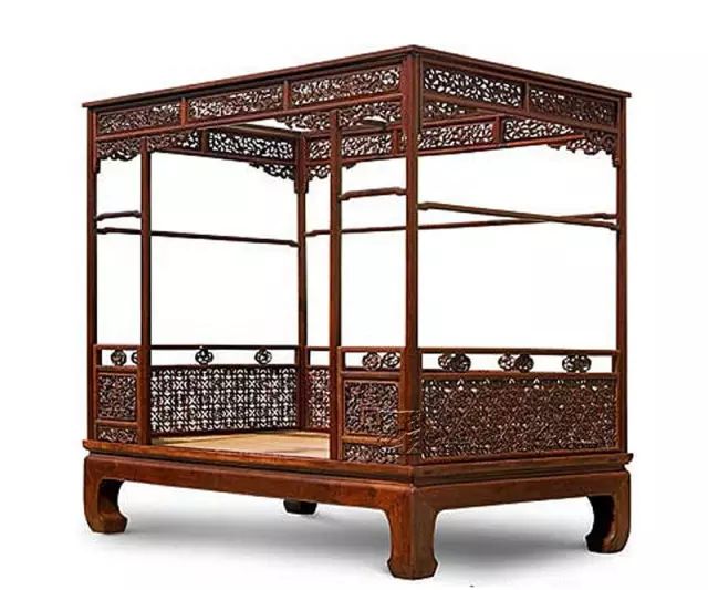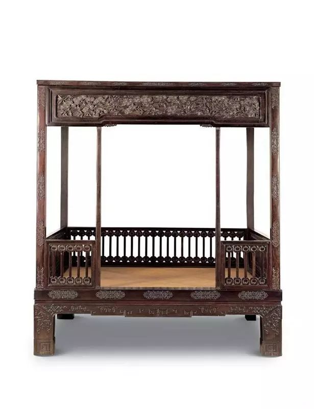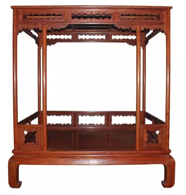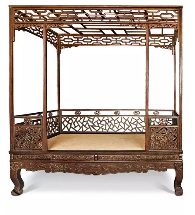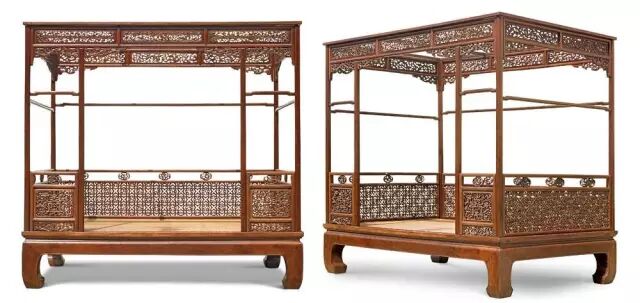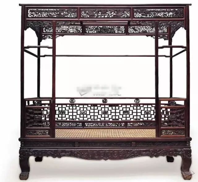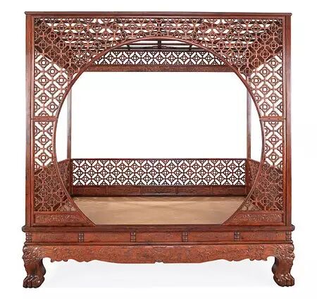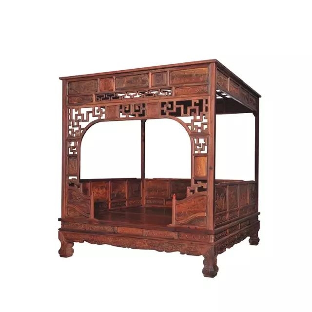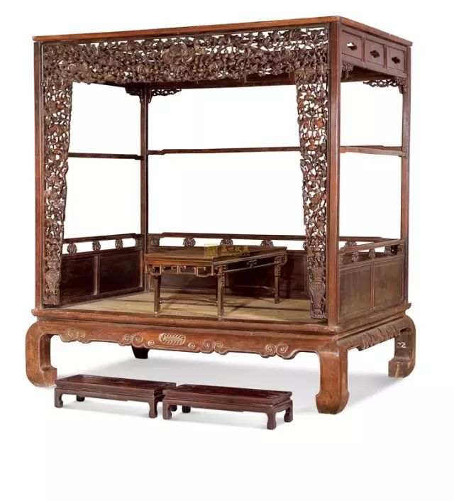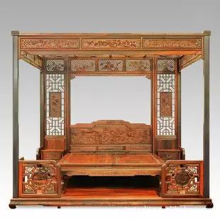 清代架子床不仅红木用料厚重,形体高大,且围栏、床柱、牙板、四足及上楣板等全部镂雕花纹,