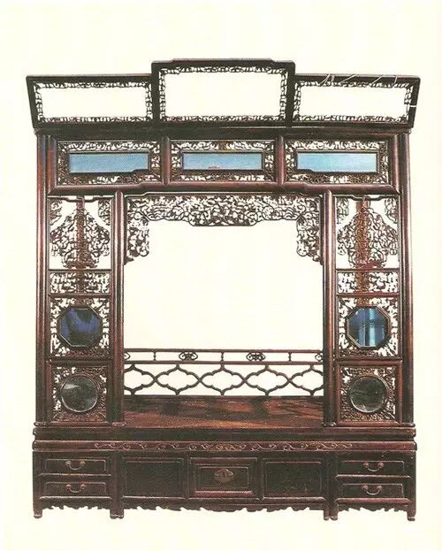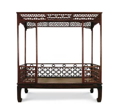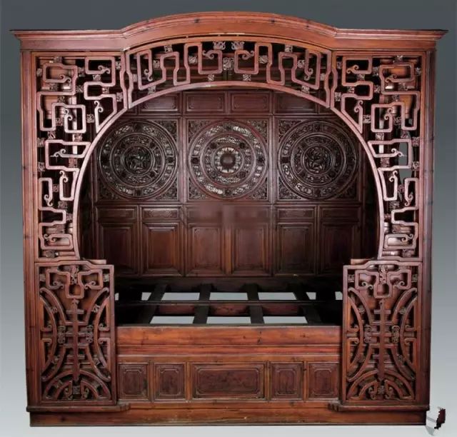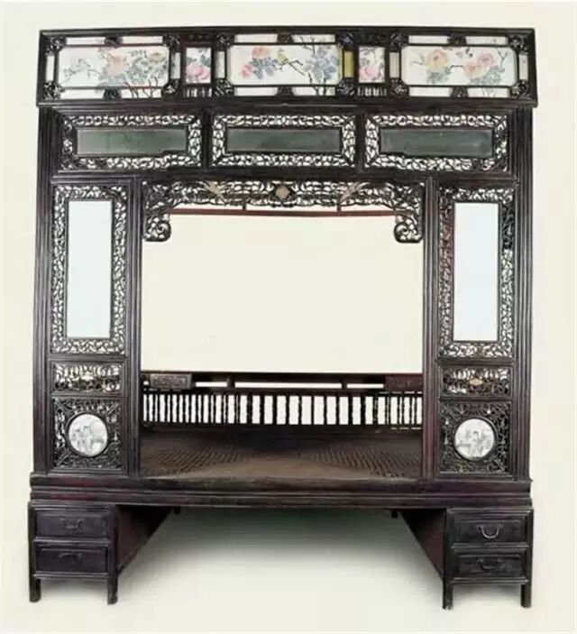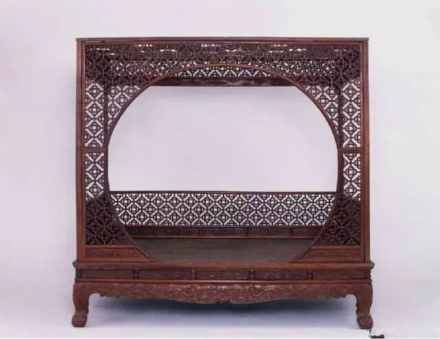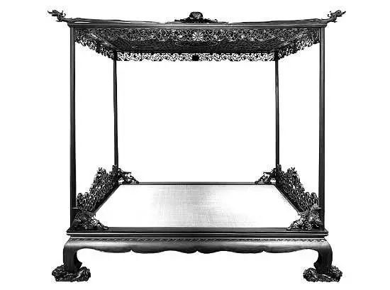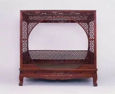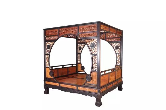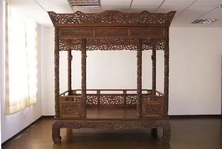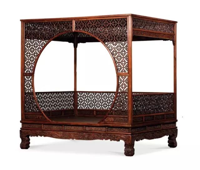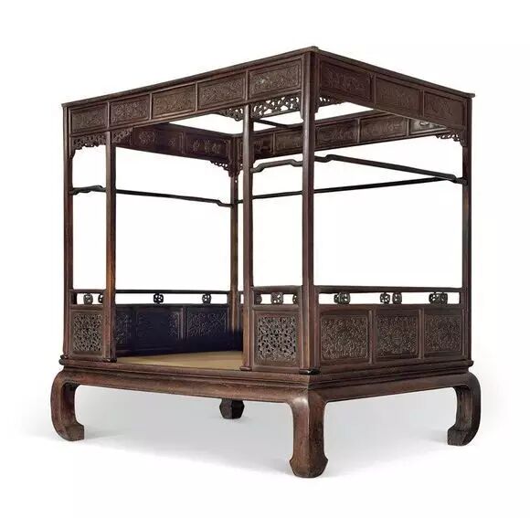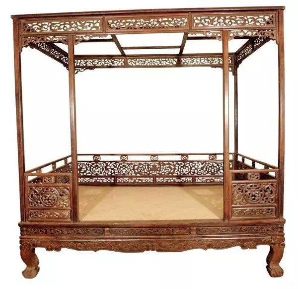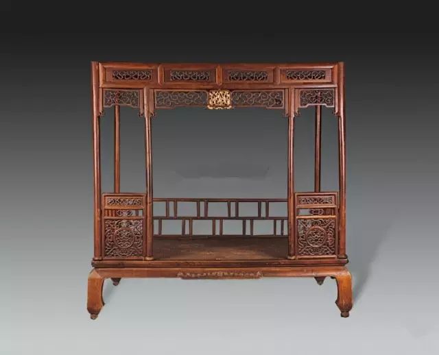 清代架子床不仅红木用料厚重,形体高大,且围栏、床柱、牙板、四足及上楣板等全部镂雕花纹,