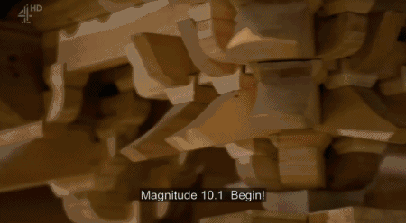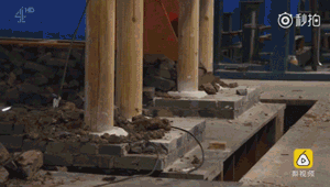 斗拱结构,如同汽车里的减震器,实验同时也解释了为什么屋顶这么重,它提供了一个反作用力,向下压,下面的灵活组件就可以立于震动之上。