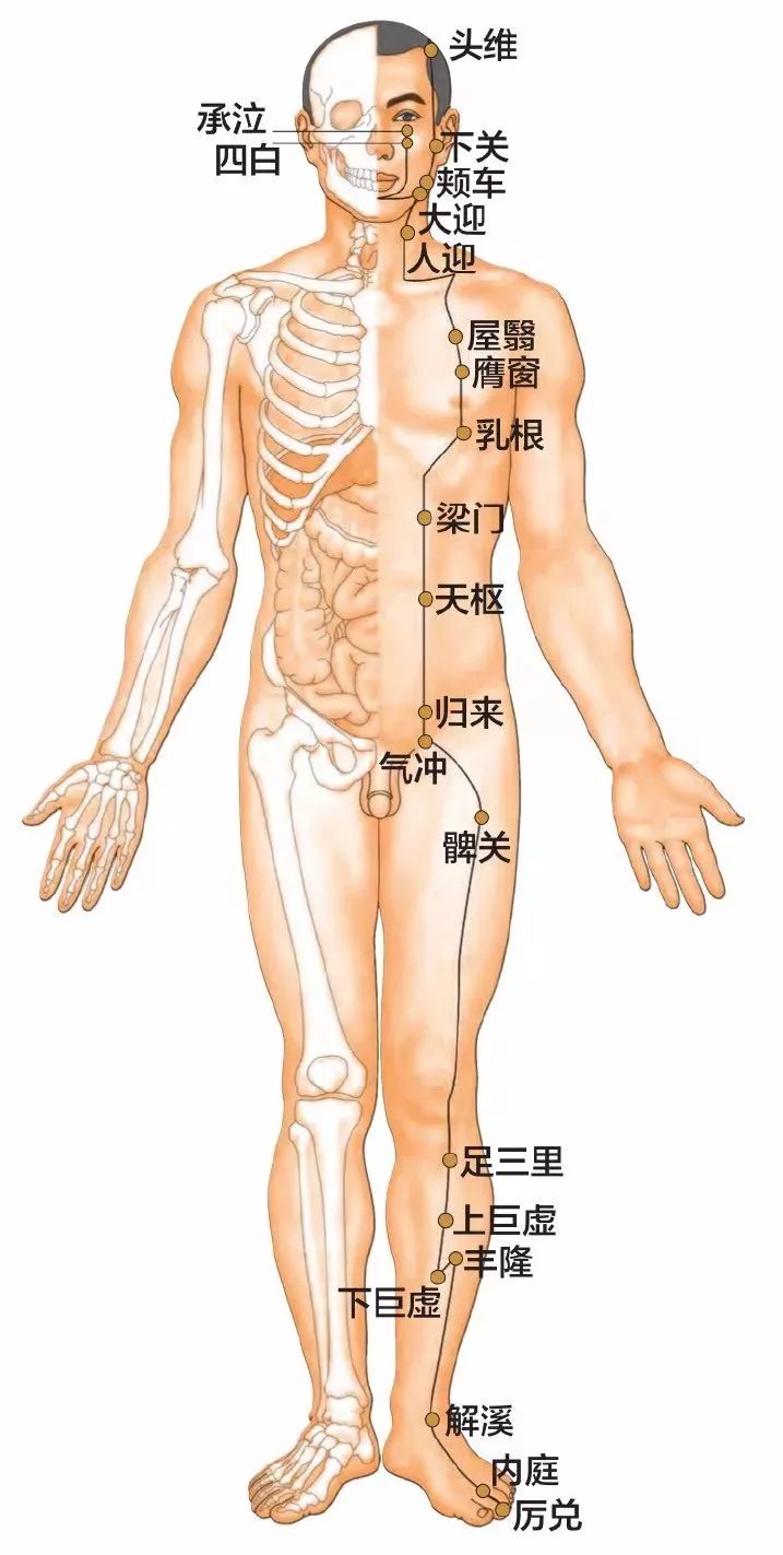 足阳明胃经分布于人体头面、胸腹、下肢外侧前缘及第2趾和大趾,循行45个穴位,首穴为承泣,末穴为厉兑。其中有11个穴位在头面颈部,19个穴位在胸腹部,其余15个穴位则分布在下肢前外侧和足部。