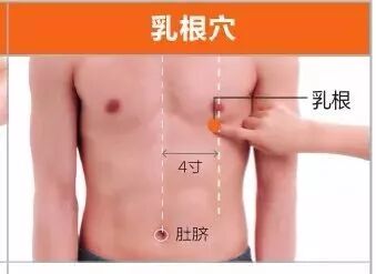 精确取穴:在胸部,当乳头直下,乳房根部,当第5肋间隙,距前正中线4寸。
