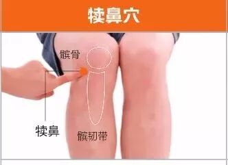 精确取穴:在膝部,屈膝时髌骨与髌韧带外侧凹陷中。