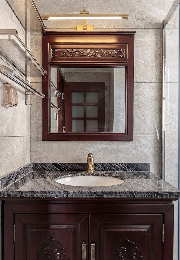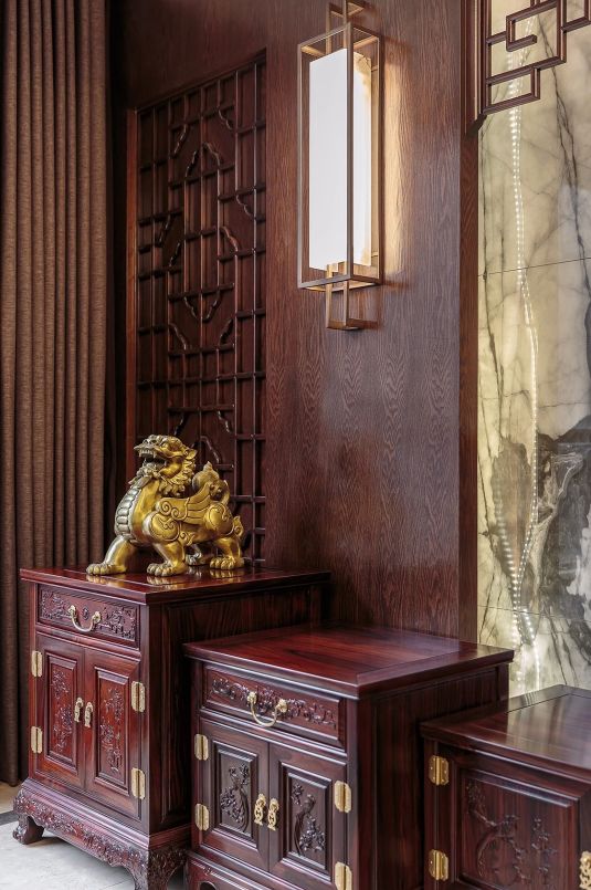 一面泼墨质感的石材铺贴出电视背景墙,为传统中式风格中添加一笔现代元素。
