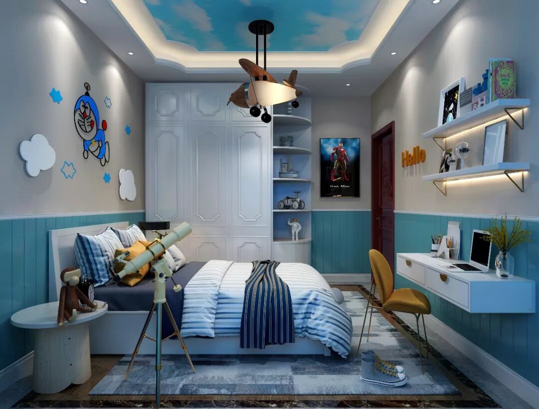 儿童房清新淡雅,仿若是置身于浩瀚奇妙的太空里,墙壁粉刷成淡蓝色,装饰着可爱的动画图案,中式风也是如此的多彩温馨!