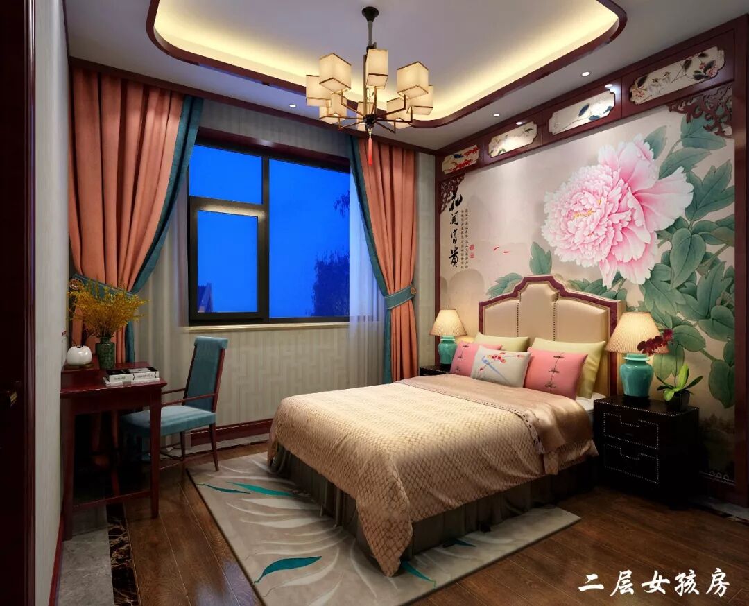 二层女儿房中式装修,有种让人心生怜爱的柔和美好,一张舒适柔软的红木大床背靠粉嫩嫩的牡丹花图。格外喜欢橙黄色的窗帘,多彩的色彩搭配热情而有格调,仿若一位眉清目秀的大家闺秀已经出现眼前!