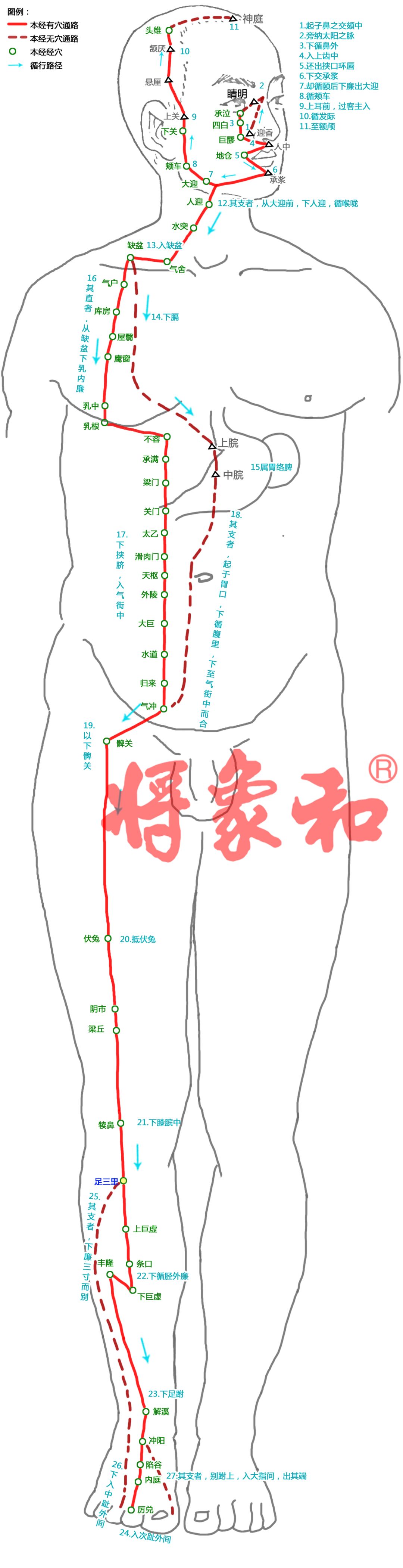 足阳明胃经是最多气多血的,好比长江般滋养中国大地,胃经滋养女人容颜。它行于整个面部,一旦脉气虚衰,面部便得不到足够气血滋养。许多胃病病人,大都面部萎黄无泽也是这个原因。