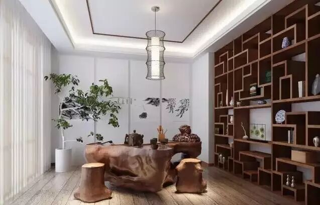 中式一般离不开木,在中国人观念了中式的房子装修,离不开木材。这与中国历史房子建筑的材料有关。以前房子建造都是采用木材,给中颜色的木材都有,且带有浓浓的自然气息。中式博古架在客厅背景墙旁边做衬托,使得空间协调不至于单调。