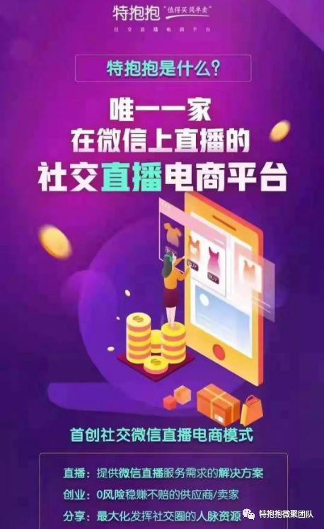 现在的社交电商平台都是分享赚,返佣这些模式。相信大家都知道,就不啰嗦了。这些模式特抱抱一样都有;但是特抱抱独有的是独一无二的微信直播窗口。