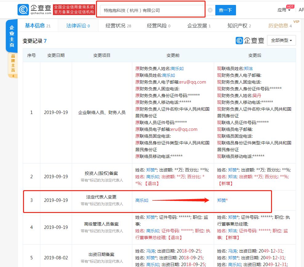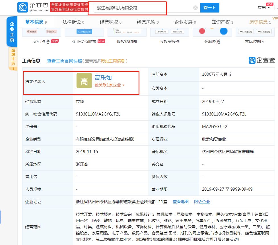 通过以上的企业查询,我们可以了解到,高乐如原先是特抱抱的法人代表,后从特抱抱公司退出,成立了新的公司---有播