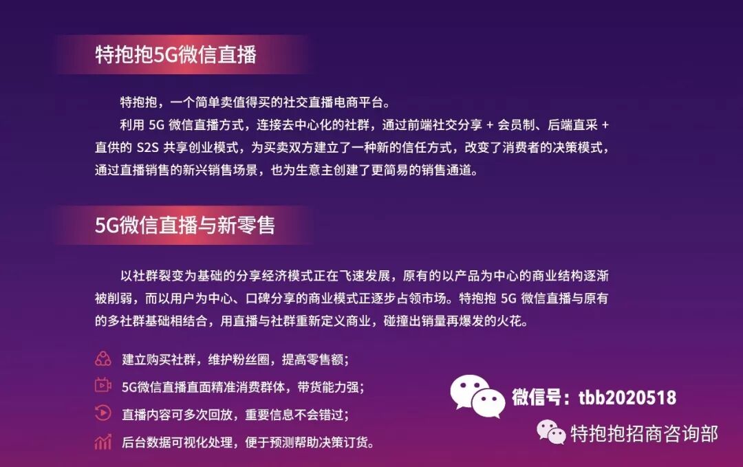 2019年特抱抱在趋势下出现了,它是一个新的零售模式,是集社交+直播+电商为一体的新零售转化系统,它以直播电商为主要切入口,通过打通微信亿级流量客群,使私域流量聚合,并以高效便利的销售工具多方位赋能线下中小商家,助其打开实体货源销量突破口,实现线下向线上拓展。