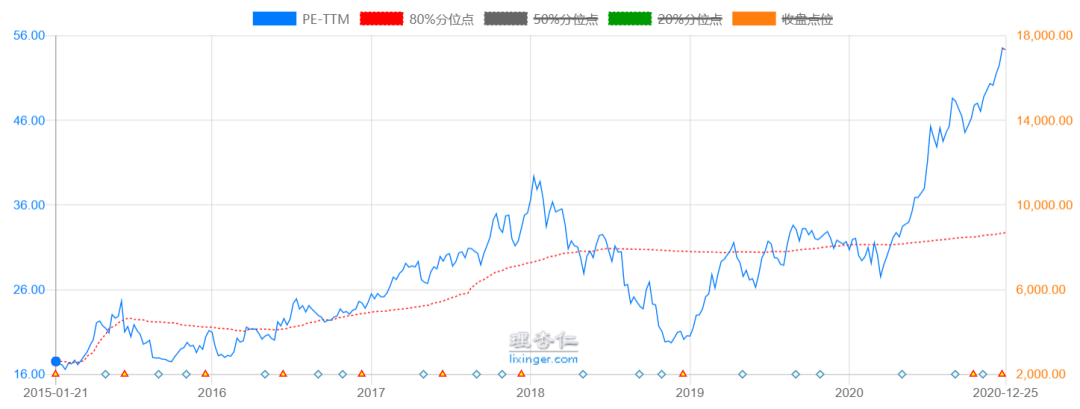 拿“中证白酒指数”来说,现在市盈率(PE)值是54.3,远远超过了2015年的牛市高点。