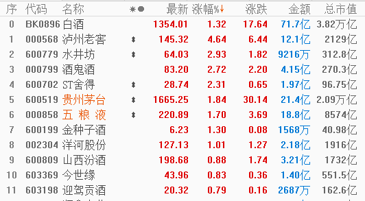 随着国庆、中秋假期将至,在消费预期提振下,白酒板块28日早盘持续走强,泸州老窖涨逾4%, 酒鬼酒、 水井坊、五粮液、 山西汾酒、 贵州茅台等跟涨。