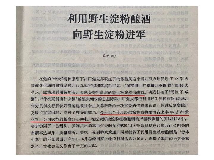 粮食酿酒全面短缺;不过,再困难的现实条件,也阻挡不了老百姓“对酒当歌”的心理诉求。代粮酒由此应运而生,其原料亦五花八门:橡子、蕨根、土茯苓、酸刺、菱角等含有淀粉的野生植物;淀粉渣、米糠、高粱糠、玉米蕊等农业副产品废料;更有甚者,稻草、高粱杆都可成为酿酒原料——代粮酿酒之疯狂可见一斑。