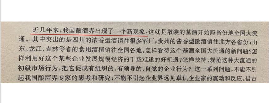 九十年代初期,酿酒界出现了一个新现象——散装的基酒开始跨省份全国大流通。四川的浓香型酒销往很多酒厂,贵州的酱香型散酒销往北方各省份、山东、黑龙江、吉林等省的食用酒精销往全国各地……(见1995年《酿酒》第四期第四十七页)。基酒大流通在当时被认作是“产地各种优势的集中体现,促进了当地酒业的发展”,如东北盛产玉米,则可大力发展酒精行业。除此之外,还具备“缩短生产周期、解决资金占用大、降低成本”的优势。