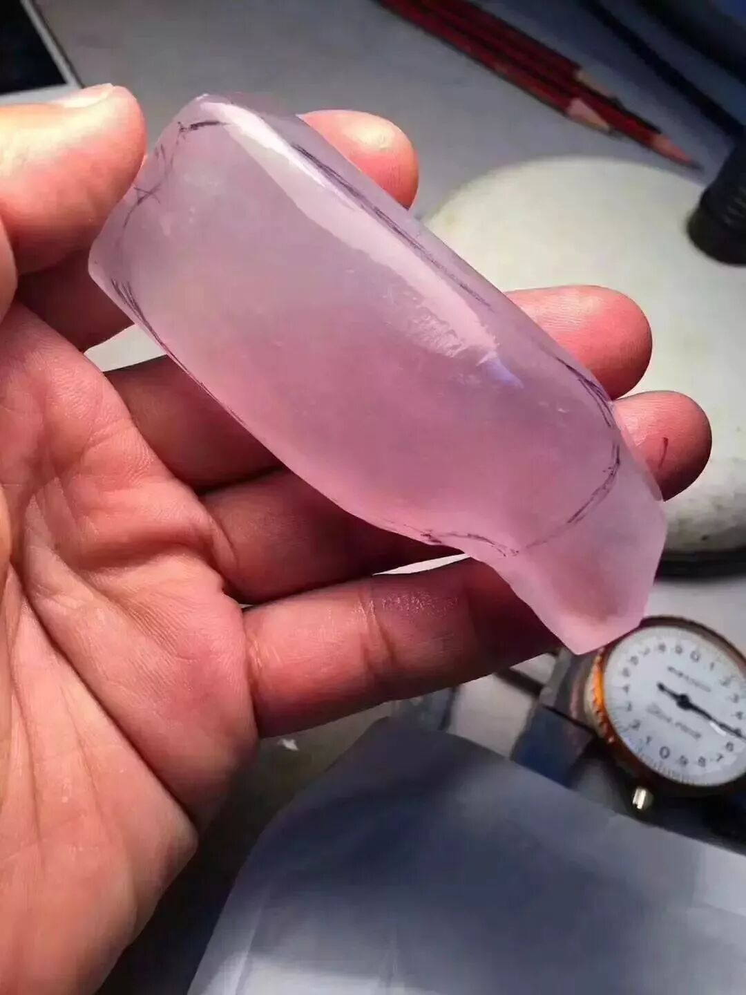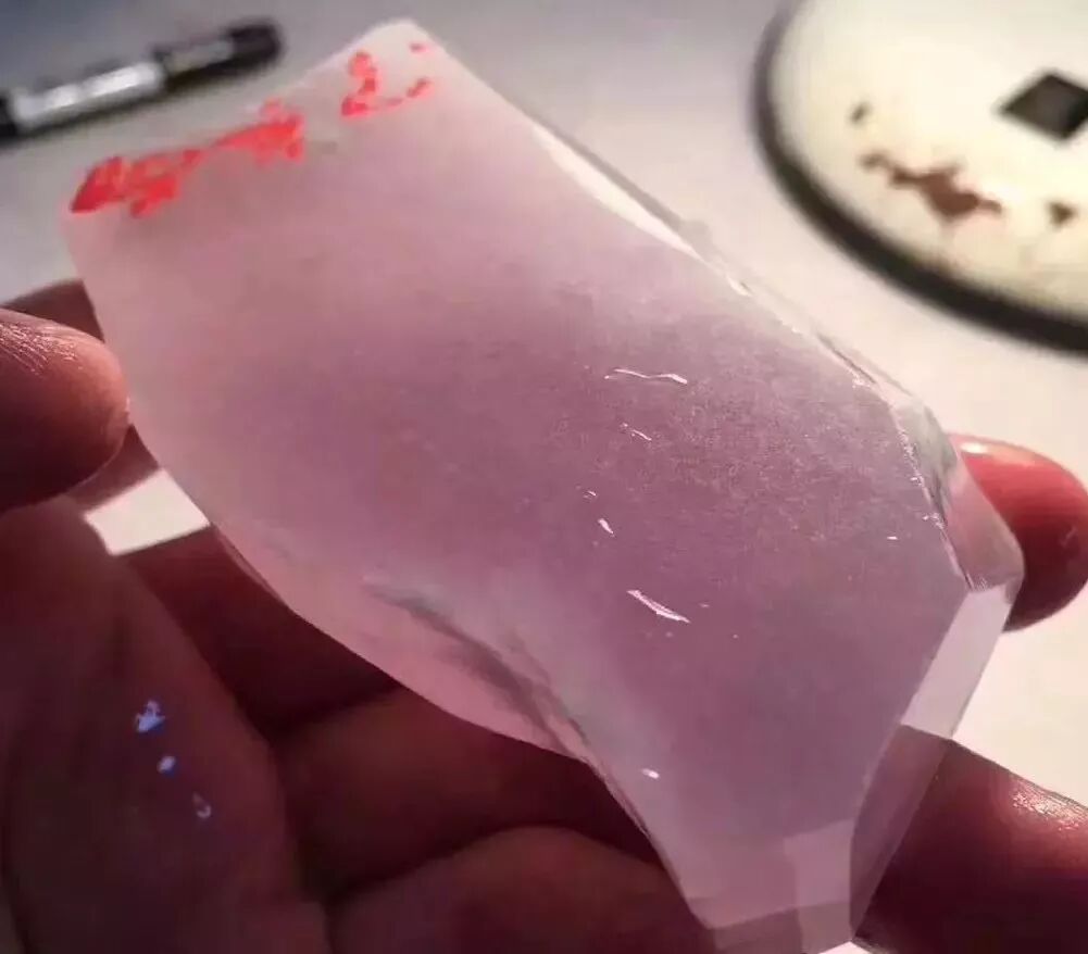 扒开皮壳后,果然没让美女失望,肉质表现很好,干净清爽,显得边角上的薄雾和杂质分外显眼,透着台灯洒下的光辉,淡淡粉粉的春色感觉就要溢出来一样。虽然扒皮之后,只有100克不到,但仍有人当场跟美女出价48万买这块原石。