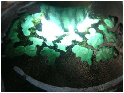 经验告诉我们,如果莫西萨原石的擦口为灰白色,地则接近米汤种,而且棉大。擦口若为深灰色,地则近冰种。擦口为乌黑色,其地为玻璃种,做出成品后光很活,“起荧”,且翡翠中白棉点也不明显了,地中只要有一丝丝绿,则在成品中就会映照出满色。