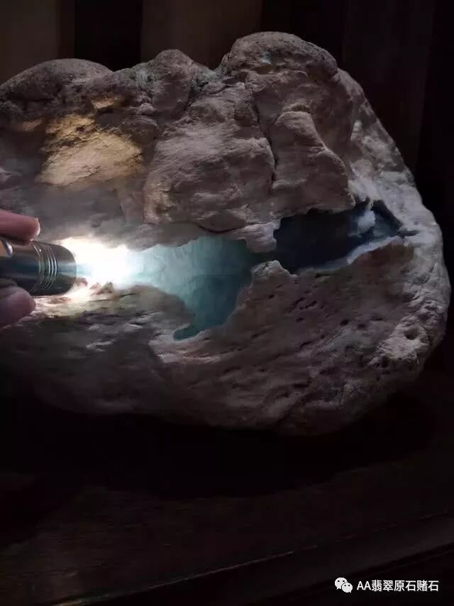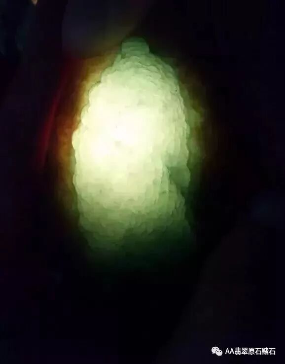 市场上普遍以现代河流冲击型砂矿的水石开此类窗口,该类型赌石多数为糯化地,基本无皮,外部靠近玉肉一层绿色蜡壳,开此类窗口打灯时玉肉均呈现有色。