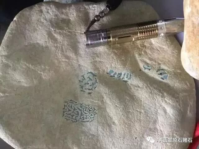 市场上普遍以残坡积矿床的半山石开此类窗口,该类型赌石多以淡绿色或者淡紫色豆地为主,颗粒间隙比较大,开此类型窗口打灯透光性较好,颜色色度加深,对判断的干扰性很大。
