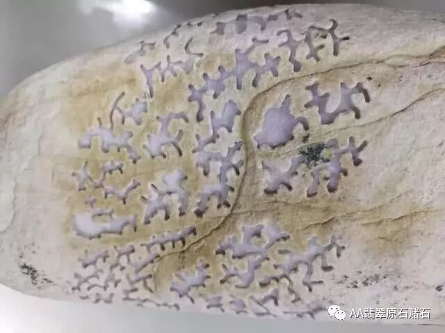 通过开多个细小的窗口,开口较小,无法判别内部种水好坏,反而打灯观察时,由于开口较小,光线容易集中,体现出的种水、质地和颜色的效果都会更好。市场上普遍以山料、半山料磨圆做假皮开此类窗口,打灯后透光度非常好,因为原生硬玉的晶体间隙比较大,光线的穿透能力也很好,尤其是淡紫色的种嫩新场料,打灯后紫色透过缝隙非常漂亮,实际上水头差、色彩淡、肉质粗。