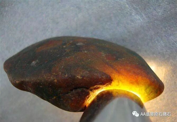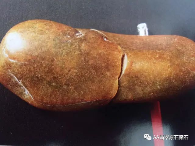 如土豆(洋芋)皮壳即意为水石的皮壳如同土豆的外表一般。如图所示,皮壳呈棕黄色,是反映原有玉石的黄雾。