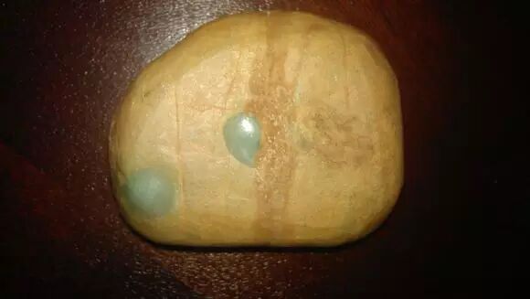 透明玻璃錾假皮仿高档翡翠赌石是利用绿色或蓝色的透明玻璃材料打磨成浑圆的鹅卵石形状,再将表面敲錾出一些密密麻麻的细小坑点,并用黄胶泥涂抹,表面开一个小窗口,由此来仿高档的玻璃种翡翠赌石毛料。
